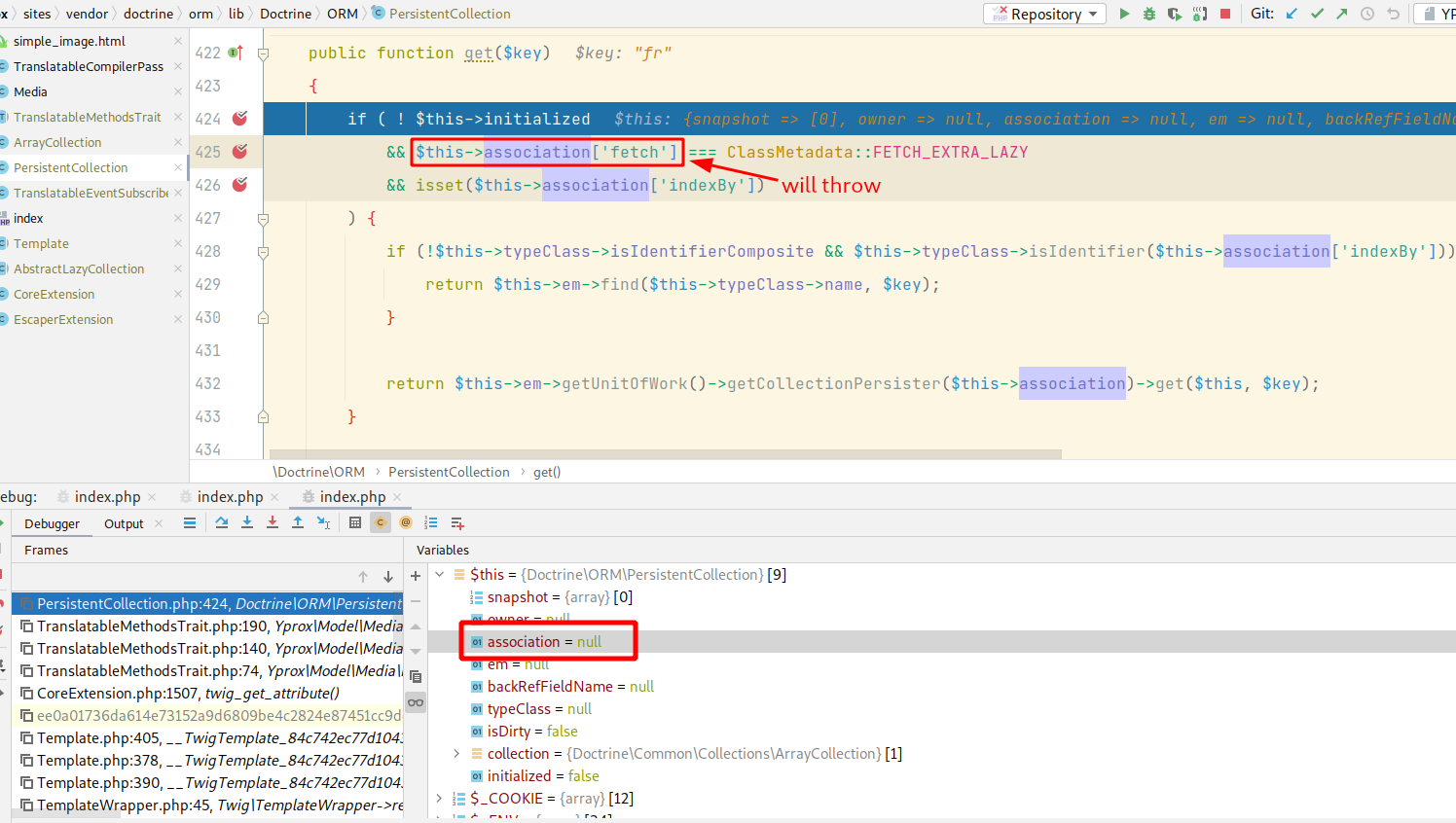 PersistentCollection#get()which try to use$this->associationwhen it is equal tonull:There are already some methods that check if