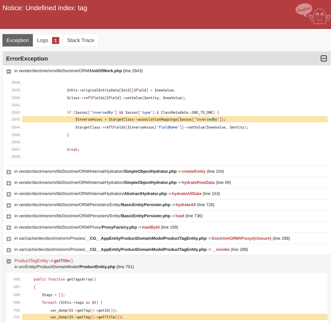$productEntity->getTagsArray();the run stops in the line where we call "title" => $t->getTag()->getTitle(),